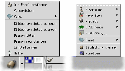 Ein Menü (Abbildung2, links), das über eines der Anwendungssymbole erreicht wird, gestattet Entfernen, Verschieben des Symbols oder das Ändern der mit dem Symbol verknüpften Anwendung. Klicken Sie auf eine freie Fläche der Taskleiste, so erscheint ein Menü zur Konfiguration der Taskleiste selbst (Abbildung2, Mitte). Über die Symbole der offenen Anwendungen lassen sich diese u.a. beenden oder auf einen anderen Desktop verschieben (nicht dargestellt). Eingebette Mini-Anwendungen sind oft mit einem Menü verbunden, dass gleichzeitig die Konfiguration dieser Anwendung ermöglicht (Abbildung 2, rechts [Beispiel zu Uhr]).